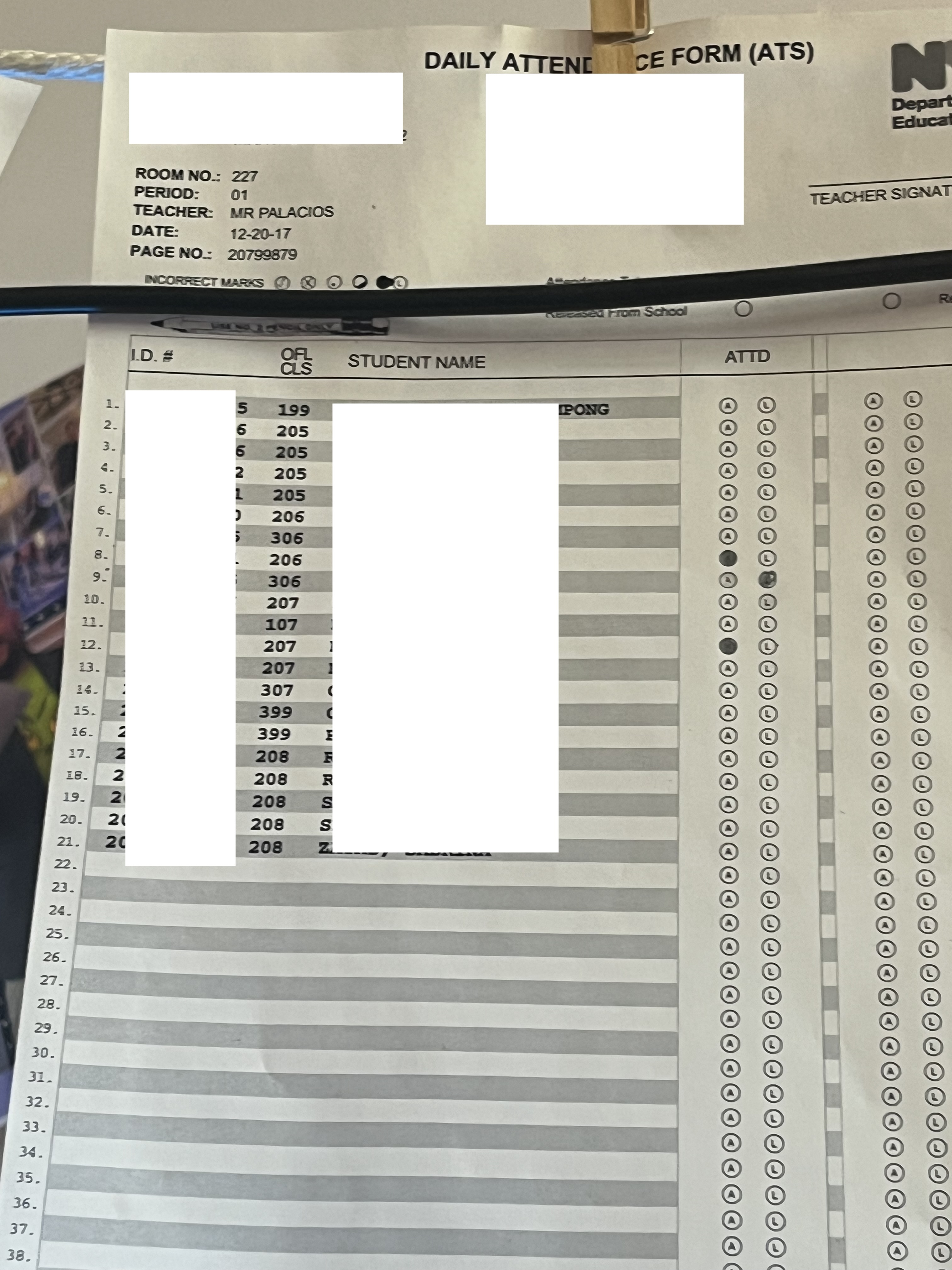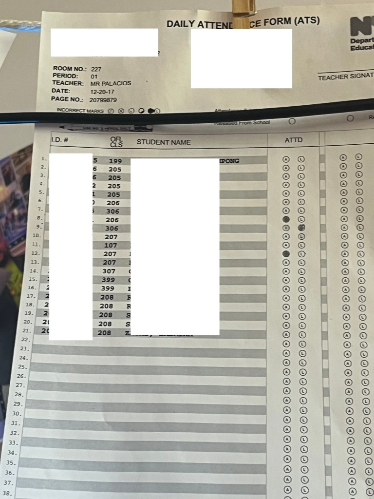 I instantly recognized them: Attendance sheets! Somehow we still use these antiquated sheets in our first period class, which marks the “official” attendance of the day. Each sheet is lined with an endless number of bubbles filled with “A” for absent and “T” for tardy.