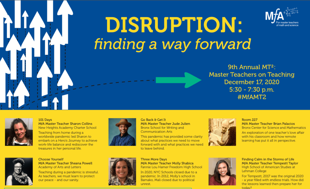 Last week, I was invited to speak at Math for America’s Master Teachers on Teaching (MT2) event. It’s a special evening that consists of several TED-style talks from MfA teachers on topics that connect to teaching and learning. I’ve been to many MT2s in person and have always walked away inspired. It’s one of many ways that MfA privileges teachers and their voice. This was the ninth annual MT2 — and the first virtual one. The theme was Disruption: Finding a Way Forward.