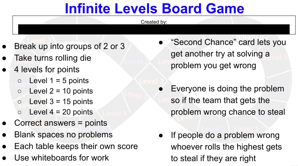 Gameplay consists of players rolling a die to make their way around a large infinity sign. Players land on spaces marked with a 1, 2, 3, or 4, which denote the level of problem they must answer to earn points (5, 10, 15, or 20 points, respectively). There are also “blackout” spaces (no points can be earned if landed on them) and “Second Chance” spaces (earns the player a card that is akin to a “Get out of Jail Free” in Monopoly; they get another try at answering the problem that they initially answered wrong). Players can steal problems from other players, too. The goal of Infinite Levels is simple: earn the most points. Each of four the tables in the room ran its own stand-alone game; my cogen students prepped all the materials the day before.